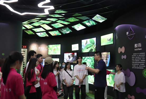 在导览员的带领下,同学们依次参观了环境教育展馆、自然教育体验区、环保设施科普展区、节水教育展厅等四大核心科普展区。场馆里还设计了丰富多样的体验游戏,让同学们沉浸式了解雾霾、酸雨、土地荒漠化、海洋污染、生物多样性丧失等环境问题,学习环境保护知识。