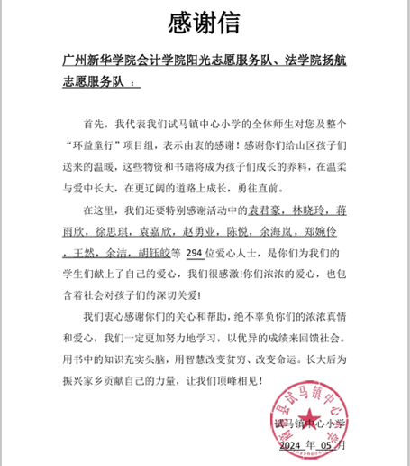 活动后,广州新华学院会计学院阳光志愿服务队、法学院扬航志愿服务队和294位爱心人士向试马镇中心小学捐赠共计135份爱心物资,其中包括爱心书籍100册和爱心文具35份。
