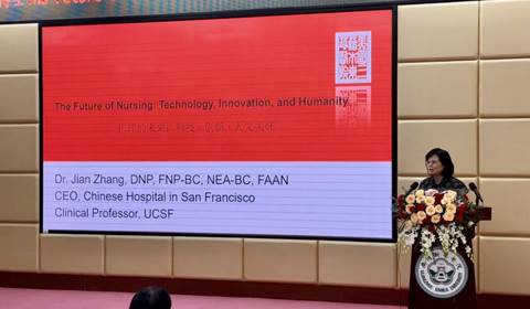 “从南丁格尔的油灯到今天的人工智能屏幕,这盏灯从未熄灭,只是以不同的方式闪耀”,张建清博士以这句富有诗意的开场白开启了演讲,瞬间吸引了全场听众的注意。她结合自身丰富的国际医疗领导经验,深入剖析了全球老龄化、人工智能技术迅猛发展的背景下,护理角色所面临的挑战与机遇。她指出,护士的角色早已不再局限于传统的床边照护,而是正朝着系统领导、科技桥梁、创新先锋等多元化方向快速发展。