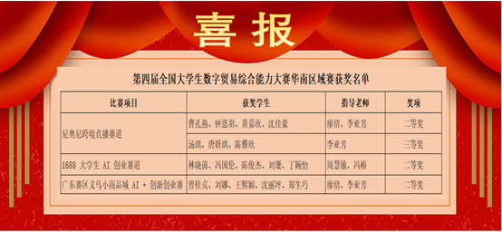 指导团队充分发挥专业优势,从赛事规则解读、项目方案打磨,到实战技能培训、模拟演练复盘,为参赛学生提供全流程、精细化指导,帮助学生精准把握数字贸易领域的创新方向与实践要点,带领6支参赛队伍报名初赛。其中4支队伍顺利晋级华南区域赛并荣获4项奖项,充分展现了我院在国际贸易人才培养领域的综合实力。