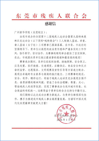 近日,广州新华学院收到一封来自东莞市残疾人联合会(以下简称“市残联”)的感谢信,信中高度赞扬了学校为东莞市承办的中华人民共和国第十二届残疾人运动会暨第九届特殊奥林匹克运动会(以下简称“残特奥会”)提供的全力支持与保障。