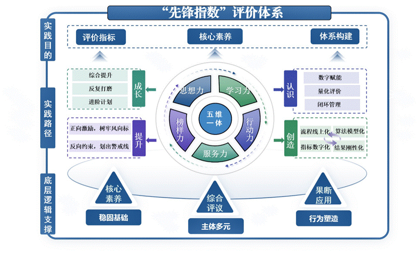 在党员先进性评价机制创新中,“先锋指数”评价体系突破传统定性评价的局限,构建了基于“思想力、学习力、行动力、服务力、榜样力”五个维度的“五维一体”数字指标体系。该体系将抽象的先进性要求转化为具有明确权重分配的量化标准,设置评价权重和评分细则,通过监督制约、考核评估、奖惩激励和完善创新机制等方面设计了一套相对科学的制度体系,从而构建了一套自律与他律、自觉与约束互补的管理机制,将抽象的先进性要求转化为20余个可量化、可考核的具体指标,使党员努力有方向、支部评价有硬杠。