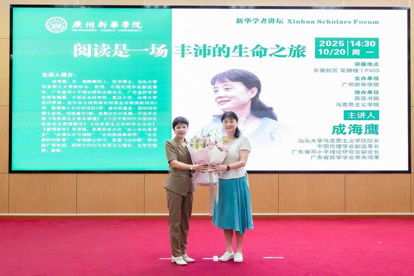 10月20日,汕头大学马克思主义学院院长、中国伦理学会副监事长、广东省邓小平理论研究会副会长、广东省哲学学会常务理事成海鹰教授应邀做客广州新华学院“学者讲坛”,以《阅读是一场丰沛的生命之旅》为题,为会计学院、信息与智能工程学院师生代表带来一场启迪思想的专题讲座。活动由校长助理蔡映辉主持。